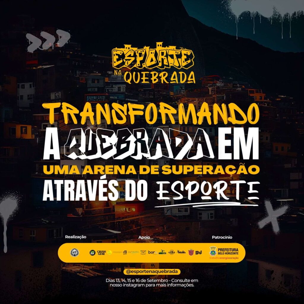 O projeto Esporte na Quebrada teve como objetivo a democratização da prática esportiva através de vivências oferecidas gratuitamente a comunidade. O evento, realizado em ambiente publico na regional leste de Belo Horizonte, deu acesso a mais de 500 pessoas a oficinas de saúde, esporte e lazer, além de ações de educação preventiva em ambiente escolar. O projeto foi patrocinado pela prefeitura de Belo Horizinte através da Secretaria Municipal de Esportes e Lazer